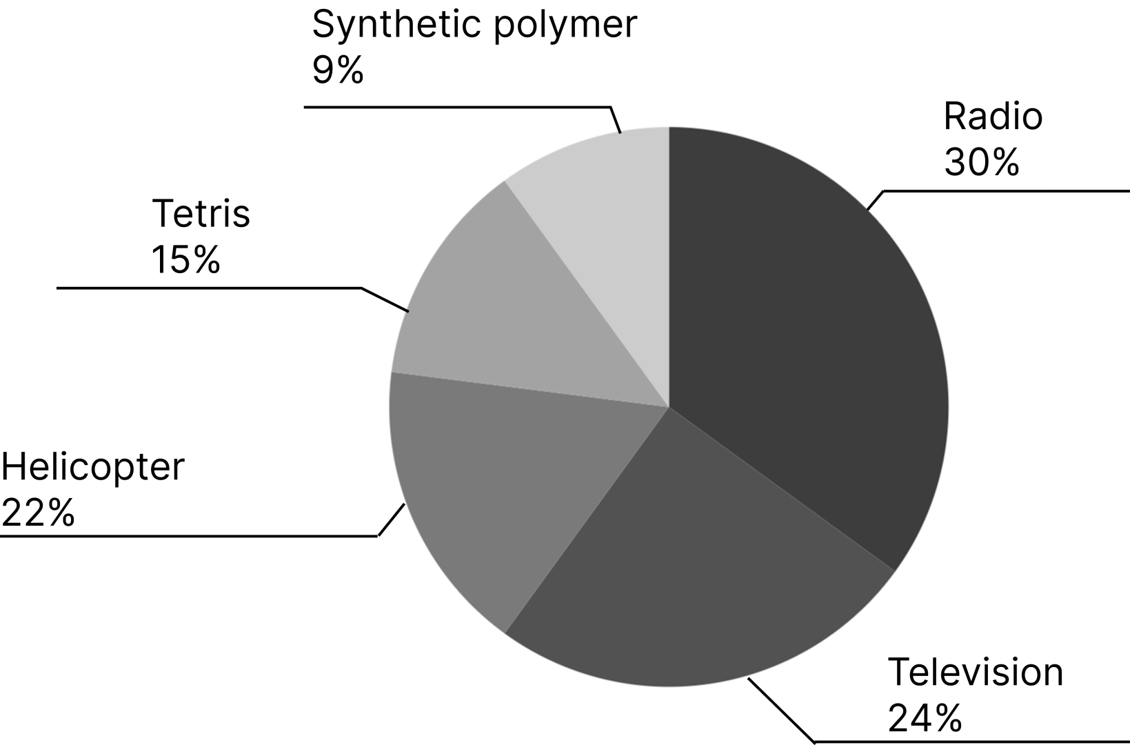 38.2 Imagine that you are doing a project on Zetlanders' opinion on the most influential Russian inventions. You have found some data on the subject — the results оf a survey conducted among Zetlanders (see the pie chart below).