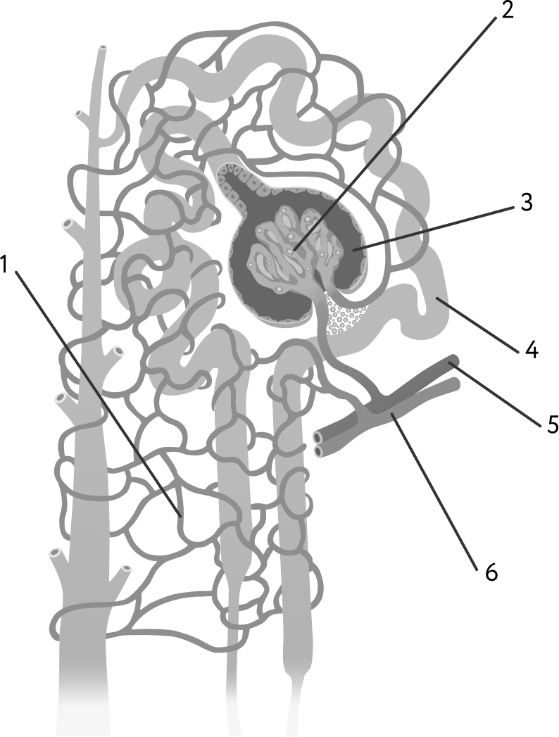 Выберите три верно обозначенные подписи к рисунку, на котором изображен нефрон почки человека.