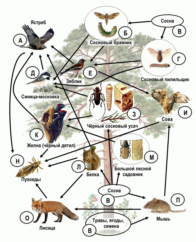 Проанализируйте биотические отношения между организмами экосистемы соснового леса. Как изменится численность сосновых бражников и ястребов, если в течение нескольких лет наблюдалось сокращение численности зябликов?
